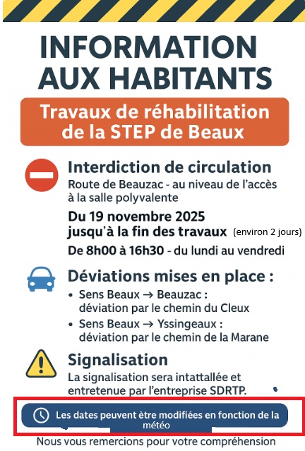 Information travaux Les travaux débuteront le mercredi 19 novembre 2025 pour une durée de deux jours. Ils pourront être reportés en fonction des conditions météorologiques